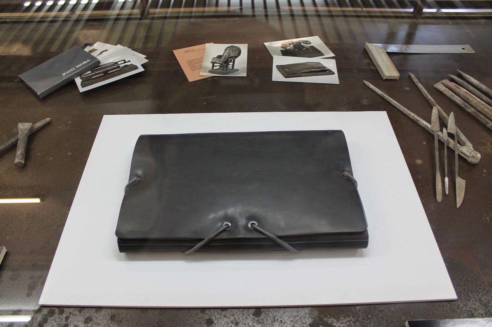 herramientas cotidianas del trabajo de Mora y la pieza escultórica cuyo