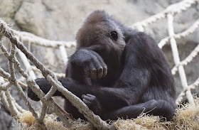 Tal y como nos habían conmovido e interesado los trabajos de animales en cautiverio de Manuela Kulpa o de Britta Jaschinski, y habiendo vivido durante un tiempo significativo de mis actividades profesionales (e inevitablemente personales) en el Zoo de Barcelona, célebre durante años por la presencia del gorila albino Copito de Nieve, al alcance de los proyectiles de su hijo Urko, me ha parecido oportuno volver a nuestra habitual antrozoología artística, preferentemente fotográfica, de la mano de la fotógrafa Eva Colomina, quien amablemente me ha ofrecido el material que ilustra este post. Gracias a nuestra coincidencia en el contexto de la Escola d'Art de l'Hospitalet, hemos podido charlar sobre diversos aspectos de este tipo de proyectos fotográficos y de su propia selección de imágenes para dar su visión de los gorilas como figurantes de un espectáculo en el que, pese a todo, viven su vida y sienten el paso de los estados de ánimo rodeados de absurdo paisaje humano itinerante y pasajero.