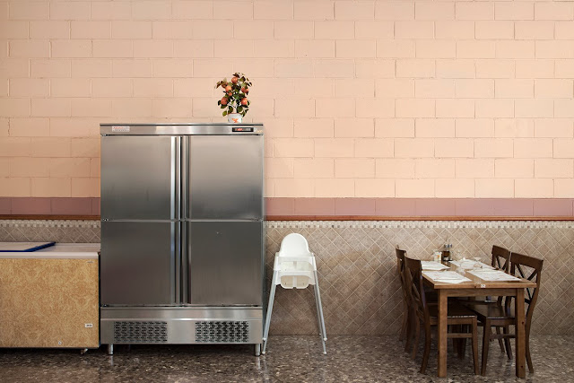 Comprobamos en la serie fotográfica de Navarrete, que los grandes locales antaño llenos de comensales en horas punta (son restaurantes de menú estratégicamente situados en zonas industriales cuyos trabajadores constituyen la base de su clientela) se muestran prácticamente vacíos y ponen en evidencia su precaria y espartana decoración interior, su desdichado feísmo o, como mínimo, su desganado interiorismo que recurre a la presencia de fotos y reproducciones gráficas comerciales en tristes marcos destinados a paliar el vacío de sus paredes. Comprobamos que tampoco faltan las plantas, naturales o artificiales, las imágenes de animales (una reproducción de la cebra de Warhol resulta especialmente significativa) y, enlazando con nuestras entradas sobre tánato-antrozoología, rescatan la presencia de piezas de taxidermia, antaño índice de abundancia cinegética, hoy signo de lo contrario.